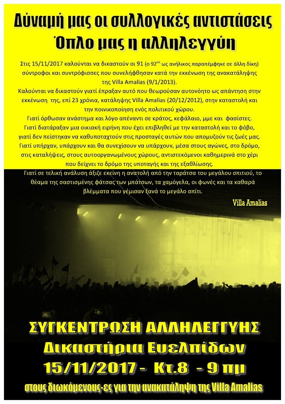 Στις 15 Νοεμβρίου 2017 δικάζονται μετά από αναβολή, στα δικαστήρια της Ευελπίδων, οι 92 αγωνιστές-στριες που πήραν μέρος στην ανακατάληψη της Villa Amalias. Το κτήριο υπήρξε για 23 χρόνια κατειλημμένο μέχρι της 20 Δεκεμβρίου του 2012 όταν αστυνομικές δυνάμεις το εκκένωσαν, συλλαμβάνοντας όσους βρίσκονταν μέσα την ώρα της εισβολής. Τα ξημερώματα της Τετάρτης 9 Ιανουαρίου του 2013 επιχειρήθηκε και ανακαταλήφθηκε το κτήριο της Villa Amalias (Αχαρνών κ Χέυδεν). Οι αστυνομικές δυνάμεις που είχαν στρατοπεδεύσει γύρω από το χώρο της Villa Amalias δεν κατάφεραν να εμποδίσουν την ανακατάληψη και μόνο μετά από τρείς ώρες και με την επιστράτευση εκατοντάδων μπάτσων όλων των ειδών κατάφεραν να μπουν στο κτήριο και να συλλάβουν τους 93 αγωνιστές-στριες. Οι συλληφθέντες κρατήθηκαν για 4 μέρες στη ΓΑΔΑ και αφέθηκαν αφότου τους απαγγέλθηκαν κατηγορίες και τους επιβλήθηκαν περιοριστικοί όροι (αναγκαστική παρουσία στο αστυνομικό τμήμα της γειτονιάς τους και απαγόρευση εξόδου από τη χώρα μέχρι τη δίκη) με βάση τον περιβόητο κουκουλονόμο.