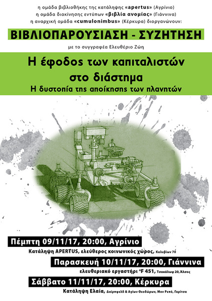 Βιβλιοπαρουσίαση-συζήτηση με το συγγραφέα Ελευθέριο Ζώη «Η έφοδος των καπιταλιστών στο διάστημα. Η δυστοπία της αποίκησης των πλανητών»