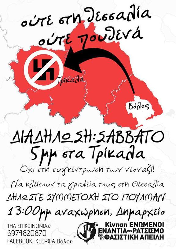 Η απάντηση του κινήματος είναι πανθεσσαλικό αντιφασιστικό συλλαλητήριο στις 5μμ στη πλ. Ρήγα Φεραίου των Τρικάλων για να φωνάξουμε "ούτε στα Τρίκαλα, ούτε πουθενά", "να τους κλείσουμε τα γραφεία".