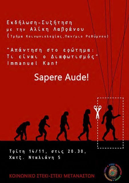 Την Τρίτη 14 Νοεμβρίου 2017, ώρα 20.30, στο Κοινωνικό Στέκι-Στέκι Μεταναστών συζητάμε το κείμενο του Ιμμάνουελ Κάντ με τίτλο «Απάντηση στο ερώτημα: Τι είναι διαφωτισμός;»