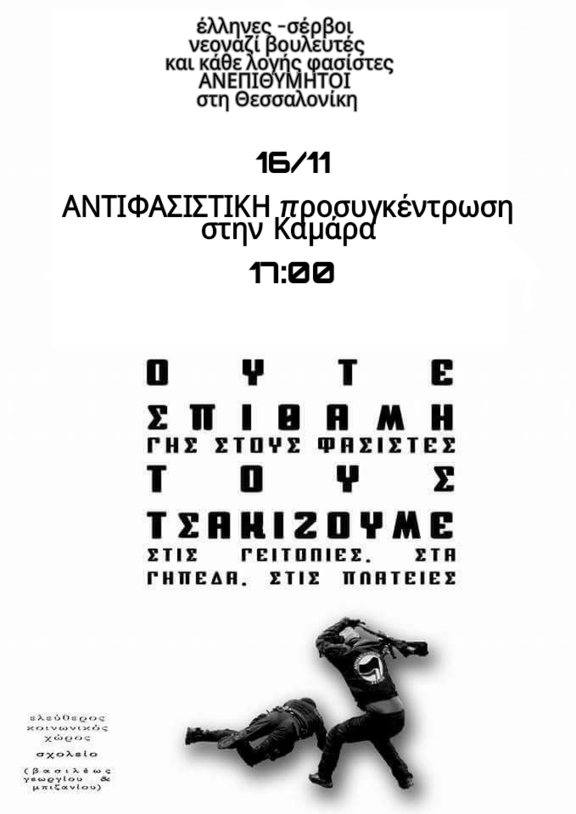 Την Πέμπτη 16/11, μία μόλις μέρα πριν την επέτειο της εξέγερσης του Πολυτεχνείου, οι φασίστες - η Χρυσή Αυγή αυτή τη φορά- διοργανώνουν συνέντευξη τύπου, στο συνεδριακό κέντρο της ΔΕΘ, από κοινού με το έτερο μνημείο μισανθρωπισμού με την επωνυμία «Εθνικό Ριζοσπαστικό Κόμμα Σερβίας».