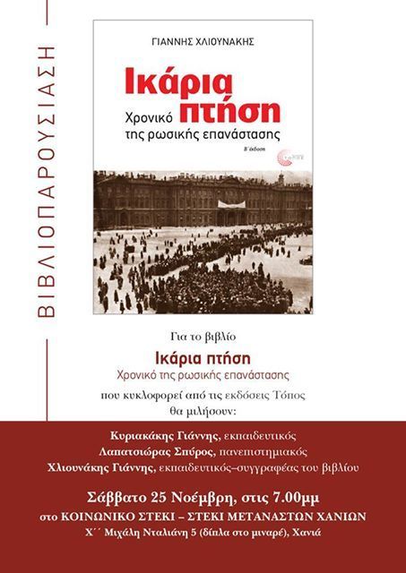 Το βιβλίο του Γιάννη Χλιουνάκη "Ικάρια πτήση - Χρονικό της Ρώσικης Επανάστασης" (των εκδόσεων ΤΟΠΟΣ) θα παρουσιαστεί το Σάββατο 25 Νοεμβρίου στις 7μμ στο Στέκι Μεταναστών - Κοινωνικό Στέκι Xανίων ( Χ" Μιχάλη Νταλιάνη 5)