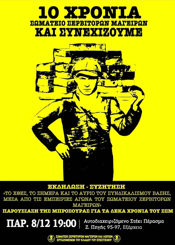Εκδήλωση-Συζήτηση: "Το χθες, το σήμερα και το αύριο του συνδικαλισμού βάσης, μέσα από τις εμπειρίες αγώνα του Σωματείου Σερβιτόρων Μαγείρων".