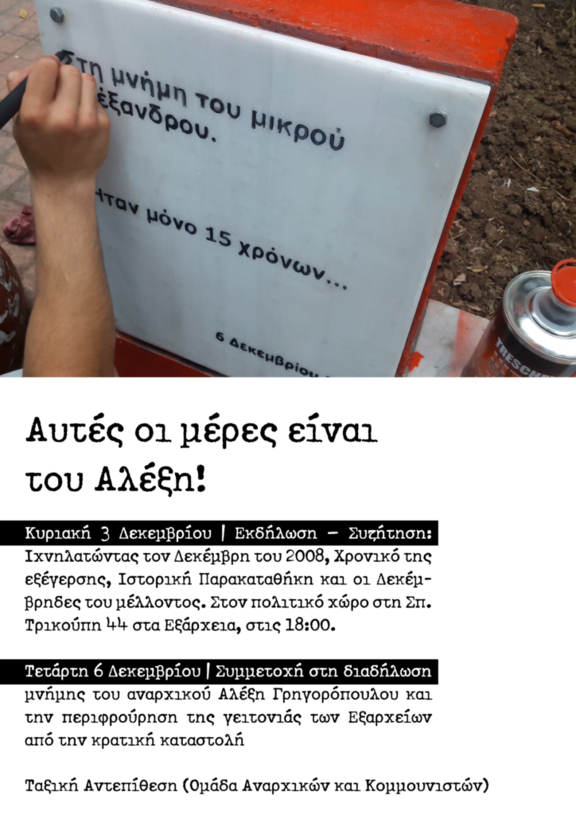 Κυριακή 3 Δεκεμβρίου | Εκδήλωση - Συζήτηση: Ιχνηλατώντας τον Δεκέμβρη του 2008, Χρονικό της εξέγερσης, Ιστορική Παρακαταθήκη και οι Δεκέμβρηδες του μέλλοντος. Στον πολιτικό χώρο στη Σπ. Τρικούπη 44 στα Εξάρχεια, στις 18:00.