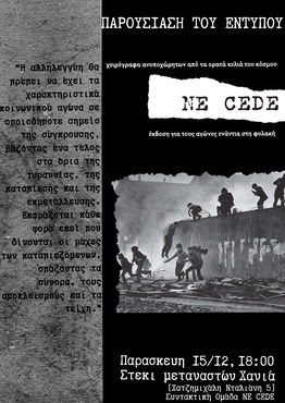 Την Παρασκευη στις 6 μ.μ στο στεκι μετανστων θα γινει η παρουσιαση του εντυπου ne cede.Μια εκδοση για τους αγωνες εναντια στις φυλακες ανα τον κοσμο.