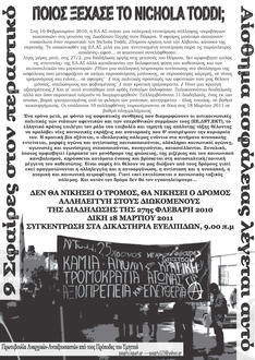Στις 16 Φεβρουαρίου 2010, η ΕΛ.ΑΣ στήνει μια πολεμική επιχείρηση σύλληψης «περιβόητων κακοποιών» στη γειτονία της Ζωοδόχου Πηγής στον Βύρωνα. 9 σφαίρες μπάτσων σκοτώνουν πισώπλατα έναν περαστικό: τον Nichola Toddi, 25χρονο εργάτη από την Αλβανία, κάτοικο της περιοχής. Το ανακοινωθέν της ΕΛ.ΑΣ μιλά για μια «επιτυχημένη επιχείρηση παρά τις παράπλευρες απώλειες» αφού… οι κακοποιοί συνελήφθησαν.
