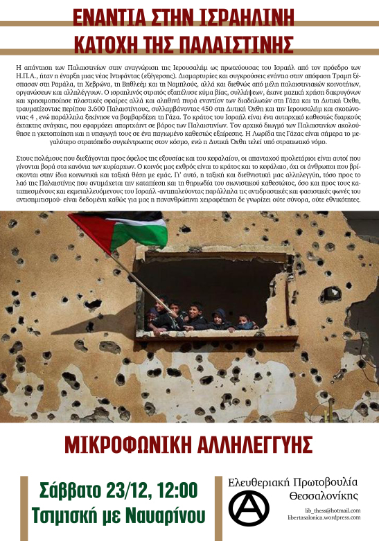 Οι διαφαινόμενες μέχρι στιγμής λύσεις του παλαιστινιακού γόρδιου δεσμού δε μπορούν να μας καλύψουν ως αναρχικούς. Οι παλαιστινιακές οργανώσεις διεξάγουν έναν εθνικοαπελευθερωτικό αγώνα για τη δημιουργία παλαιστινιακού κράτους ενδύοντάς τον άλλοτε με φονταμενταλιστικά και εθνικιστικά στοιχεία (βλ. Φατάχ και Χαμάς) ή ακολουθώντας το δρόμο του ορθόδοξου λενινισμού (βλ. Λαϊκό Μέτωπο για την Απελευθέρωση της Παλαιστίνης). Ο Οργανισμός Ισλαμικής Συνεργασίας αναγνωρίζει την ανατολική Ιερουσαλήμ ως πρωτεύουσα της Παλαιστίνης και τη δυτική Ιερουσαλήμ ως πρωτεύουσα του Ισραήλ. Για μας η λύση του οποιουδήποτε είδους κρατισμού αποτελεί απομάκρυνση από την κοινωνική και ταξική χειραφέτηση των καταπιεσμένων. Δε μπορούμε, παρόλα αυτά, να παραγνωρίσουμε εντελώς τα απτά δεδομένα της εκεί πραγματικότητας, το γεγονός δηλαδή ότι οι αναρχικοί αγωνιστές της περιοχής αποτελούν έναν μειοψηφικό πόλο με περιορισμένες δυνατότητες κοινωνικής απεύθυνσης. Συνεπώς, οι αντιεξουσιαστικές και αντικρατικές θέσεις δεν έχουν, δυστυχώς, την προοπτική να κοινωνηθούν στα ευρύτερα κομμάτια των αντιστεκόμενων, διαμορφώνοντας έναν άλλο πόλο. Το γεγονός αυτό, όμως, δε μας κάνει να μη στεκόμαστε αλληλέγγυοι με τους Παλαιστίνιους και τις Παλαιστίνιες που αγωνίζονται για την ίδια τους την επιβίωση, ενάντια στο τυραννικό καθεστώς που επιβάλλει το Ισραήλ.