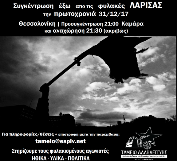 Το βράδυ της πρωτοχρονιάς, 31/12/2017, θα βρεθούμε δίπλα στους φυλακισμένους αγωνιστές που βρίσκονται έγκλειστοι στις φυλακές (κατάστημα κράτησης) Λάρισας.