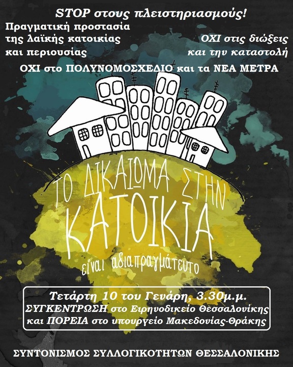 - καλούμε την Τετάρτη 10 του Γενάρη, με τους 21 προγραμματισμένους πλειστηριασμούς στη Θεσσαλονίκη και 240 πανελλαδικά και την τροπολογία-ΙΔΙΩΝΥΜΟ του Κοντονή σε ισχύ, σε μαζική συγκέντρωση στις 3.30μ.μ., στο Ειρηνοδικείο Θεσσαλονίκης και πορεία προς το υπουργείο Μακεδονίας-Θράκης στη συνέχεια, ενάντια στην πολιτική των πλειστηριασμών και της αρπαγής της λαϊκής κατοικίας και περιουσίας από τράπεζες και κράτος