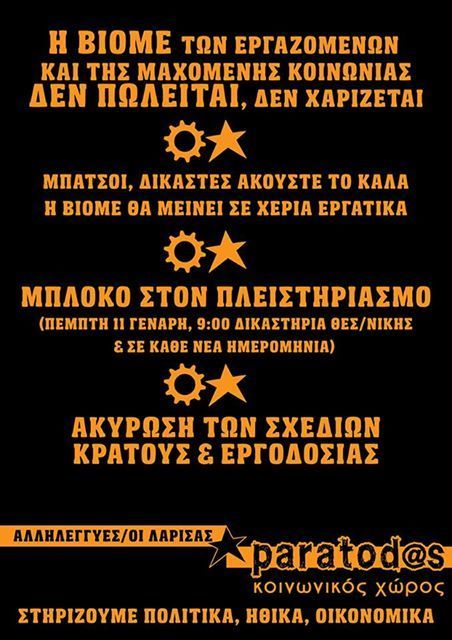 - Στεκόμαστε στο πλευρό του σωματείου εργατουπαλλήλων της ΒΙΟ.ΜΕ. και μπλοκάρουμε κάθε προσπάθεια για πλειστηρισμό 11, 18 και 25 Γενάρη από τις 11 το πρωί στα δικαστήρια Θεσσαλονίκης.