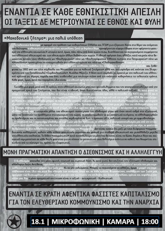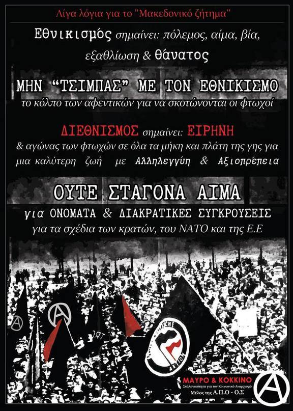 Για μας ο διεθνισμός δεν είναι κάτι αφηρημένο, ένας ελιγμός για να ξεφύγουμε από τη δύσκολη θέση της υπάρχουσας κατάστασης όπου δεσπόζει η καταπίεση και η μισαλλοδοξία. Διεθνισμός σημαίνει αγώνας ενάντια στον εθνικισμό ως ενιαία και αλληλοτροφοδοτούμενη αντίληψη. Σημαίνει την επαφή, συζήτηση και σύμπραξη με συντρόφους σε άλλες χώρες ώστε να αντιπαλέψουμε από κοινού τις συγκρούσεις στις οποίες πάνε να μας εμπλέξουν τα κράτη για να εξυπηρετήσουν τα συμφέροντα των αρχουσών τάξεων σε κάθε χώρα, να αντιπαλέψουμε τα σχέδια των πλανητικών αφεντικών του ΝΑΤΟ και της Ε.Ε. όχι όμως προσπαθώντας δήθεν να «εκτρέψουμε» τον εθνικισμό ενάντια στις υπερεθνικές ενώσεις, όπως βαυκαλίζεται ότι κάνει ένα τμήμα της αριστεράς, αλλά με πραγματικούς κοινωνικούς και ταξικούς αγώνες σε κάθε πλευρά των συνόρων. Με την έμπρακτη αλληλεγγύη μας σε αγωνιστές σε κάθε χώρα που διώκονται και φυλακίζονται από τις αστυνομίες και τα κράτη τους. Γνωρίζουμε πολύ καλά ότι το ζήτημα του ονόματος είναι μια κοροϊδία. Πρώτα απ' όλα γιατί δεν έχει να κάνει σε τίποτε η διαχείριση του με την ιστορία, τον πολιτισμό και τα τοιαύτα, γιατί εάν είχε να κάνει με αυτά τα ανθρώπινα η λύση θα ήταν εύκολη και θα είχε προκύψει εδώ και καιρό με κοινωνικούς όρους. Χιλιάδες άνθρωποι Έλληνες και Σλαβο-Μακεδόνες αλλάζουν πλευρά στα σύνορα δίχως κανένα πρόβλημα. Το πρόβλημα είναι η ίδια η ύπαρξη του συνόρου. Όλων των συνόρων. Το «ζήτημα» είναι πολιτικό. Βαφτίζεται εθνικό ζήτημα για να μην υπάρχει καμιά αμφιβολία ότι η ελληνική αστική τάξη θέλει να κυριαρχήσει στην οικονομική εκμετάλλευση της περιοχής χωρίς καμία αντίδραση. Σε αυτή τη διαδικασία η κάθε πλευρά χρησιμοποιεί τους εθνικιστές ως «ομάδα πίεσης» κάτι τέτοιοι στα Σκόπια σκαρφίστηκαν ότι είναι απόγονοι του Μ. Αλεξάνδρου και κάτι παρόμοιοι στην Αθήνα κατασκεύασαν την εθνική ταυτότητα με Αρχαία Ελλάδα, Βυζάντιο και άλλες φανταστικές εξιστορήσεις. Οι μεν επιλέγουν να ονομάζονται Μακεδόνες για να τονίσουν την υποτιθέμενη αρχαία καταγωγή τους και οι δε αποκαλούν μια χώρα ως πρώην επαρχία μιας άλλης χώρας που δεν υπάρχει πια. Η γελοιότητα δίνει και παίρνει. Όμως από το γελοίο εύκολα μπορούμε να βρεθούμε στο επικίνδυνο. Αφενός η αναβάθμιση των εθνικιστικών παθών σε μια περίοδο όπου ο παγκόσμιος καπιταλισμός βρίσκεται σε κρίση και οι ανταγωνισμοί εύκολα ξεσπούν σε περιφερειακές συγκρούσεις, η προοπτική της μεταφοράς αυτών των συγκρούσεων σε πολεμικά μέτωπα και στη Δύση ολοένα αυξάνεται. Εμπόλεμη κοινωνία είδαμε πολύ καλά τι σημαίνει στην υπόθεση της Συρίας και άλλων χωρών, οι εθνικιστικές συμμορίες να λυμαίνονται τους δρόμους όσο τα γεράκια των δυνάμεων διαλύουν τη χώρα, ένας λαός στην προσφυγιά.