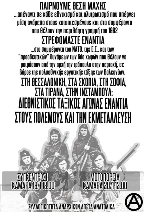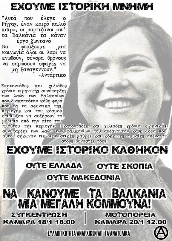 Για ακόμα μία φορά το ζήτημα της ονομασίας της Μακεδονίας βρίσκεται στο προσκήνιο. Οι καταπιεσμένοι και εκμεταλλευόμενοι αυτού του κόσμου δεν έχουμε να χωρίσουμε τίποτα μεταξύ μας. Βρισκόμαστε στο ίδιο ταξικό στρατόπεδο, παρά τα όσα διαγγέλλουν οι "εθνικές" αφηγήσεις, που θέλουν να διαιωνίσουν την πολιτική ανελευθερία και την οικονομική εκμετάλλευση των από τα κάτω. Ο κοινός μας εχθρός είναι το κράτος και το κεφάλαιο, όχι οι άνθρωποι που βρίσκονται στην ίδια κοινωνική και ταξική θέση με εμάς. Να μην αφήσουμε τα αφεντικά να μας διαχωρίσουν βάσει φυλής, θρησκείας, χρώματος, σεξουαλικής κατεύθυνσης, κατεύθυνσης φύλου και κάθε άλλης διαχωριστικής γραμμής (straight/lgbtqia+, νόμιμος εργάτης/χωρίς χαρτιά, γυναίκα/άντρας, λευκός/μαύρος, νέος/γέρος κ.α.).