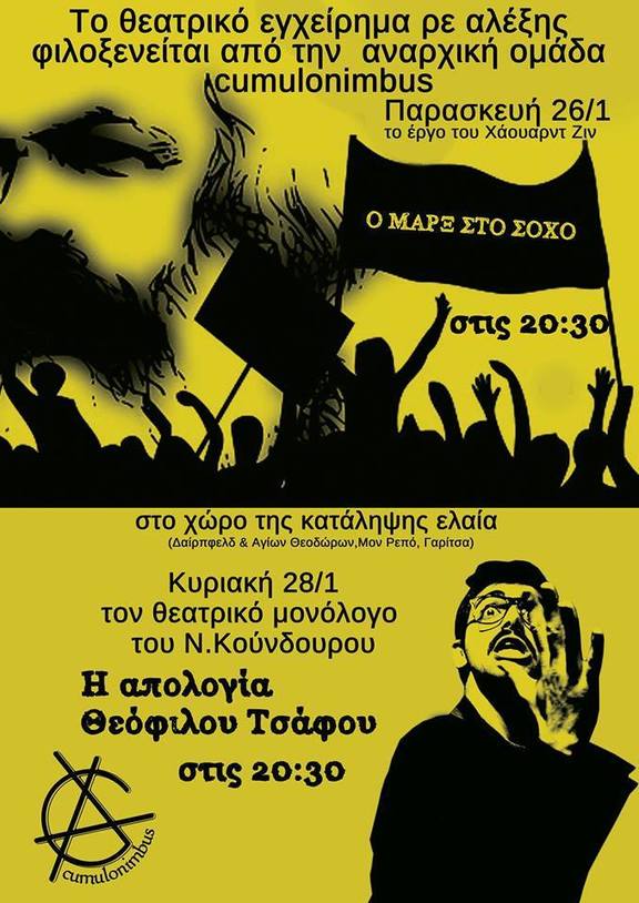 Το θεατρικό εγχείρημα «Ρε Αλέξης» με την θεατρική παράσταση του έργου του Χάουαρντ Ζιν «Ο Μαρξ στο Σόχο» φιλοξενείται στις 26/01 από την αναρχική ομάδα Cumulonimbus στο χώρο της Κατάληψης Ελαία. Ώρα έναρξης 20:30.
