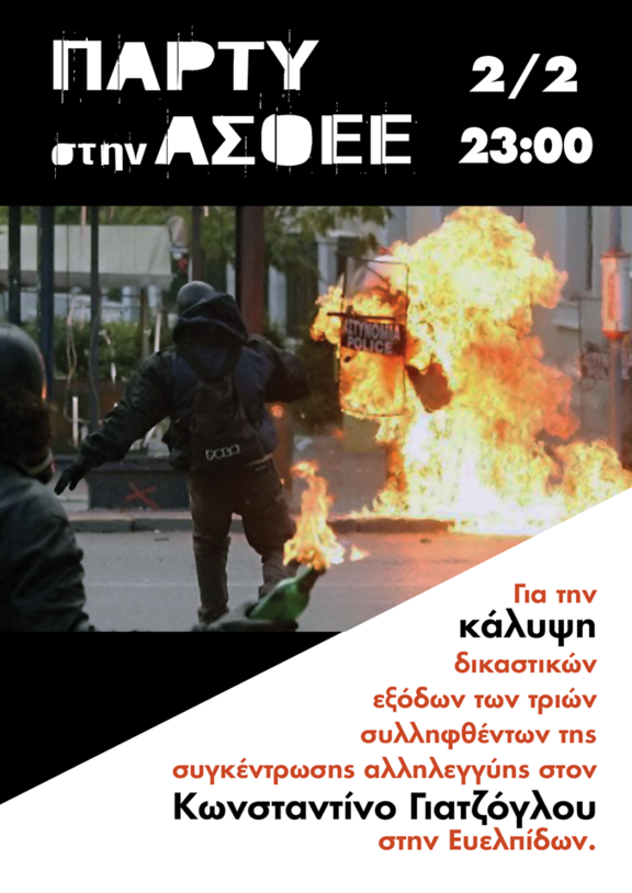 Party για την κάλυψη δικαστικών εξόδων των τριών συλληφθέντων της συγκέντρωσης αλληλεγγύης στον Κωνσταντίνο Γιατζόγλου στην Ευελπίδων.