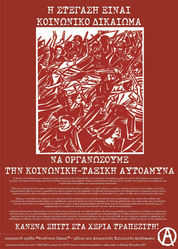 Οι ύπουλες μεθοδεύσεις του κράτους, των αφεντικών, των τραπεζιτών και των συμβολαιογραφικών τους εκπροσώπων θα πέσουν στο κενό. Καμιά απόπειρα έξωσης δεν θα γίνει ανεκτή. Να περιφρουρήσουμε τις γειτονιές μας, να εφαρμόσουμε στην πράξη την κοινωνική αλληλεγγύη και την ταξική αυτοοργάνωση.