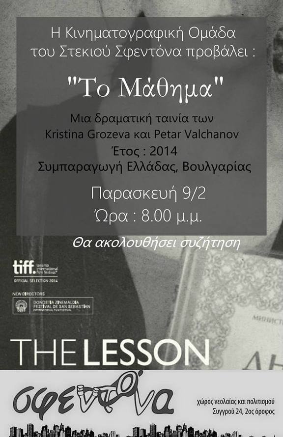 Η κινηματογραφική του Στεκιού Σφεντόνα την Παρασκευή 9/2 στις 20.00 θα προβάλει "Το μάθημα" σκηνοθεσίας Κριστίνα Γκρόζεβα και Πέταρ Βαλτσάνοφ.