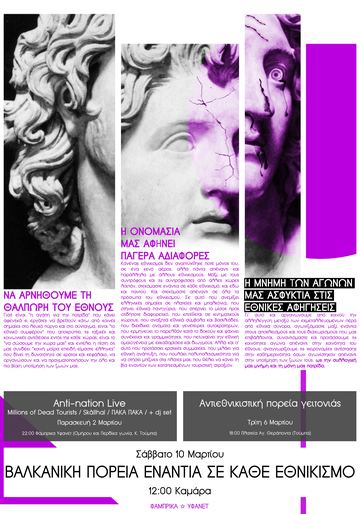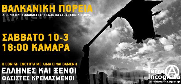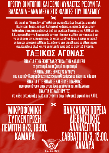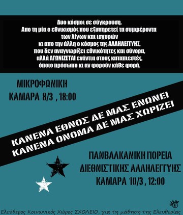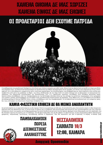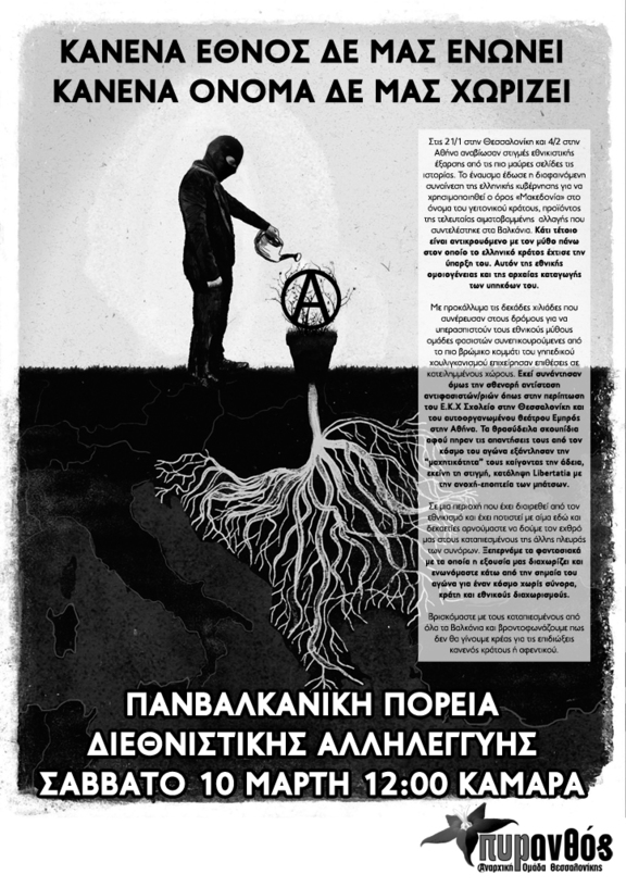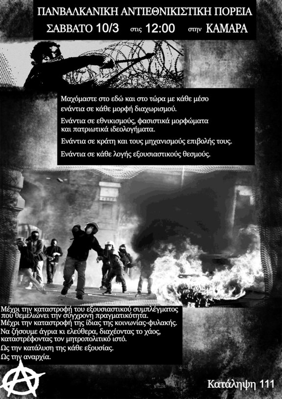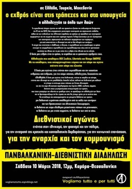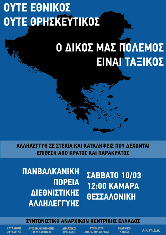 ές από τις πτυχές της επίθεσης που έχουν εξαπολύσει κράτος και κεφάλαιο εναντίον μας. Και η μόνη πραγματική αντίσταση είναι η ταξική-αντικρατική-διεθνιστική.» Και αυτό ακριβώς θα κάνουμε στις 10 του Μάρτη. Δίπλα-δίπλα με συντρόφους και συντρόφισσες από άλλες βαλκανικές -κι όχι μόνο- χώρες θα αναδείξουμε ότι υπάρχουν άνθρωποι που αντιστέκονται στον παραλογισμό του πολέμου, του μίσους και του εθνικισμού, άνθρωποι που βλέπουν τους πραγματικούς εχθρούς απ' όλες τις πλευρές των συνόρων, που δεν είναι άλλοι από το κράτος και το κεφάλαιο, μαζί με τις εφεδρείες