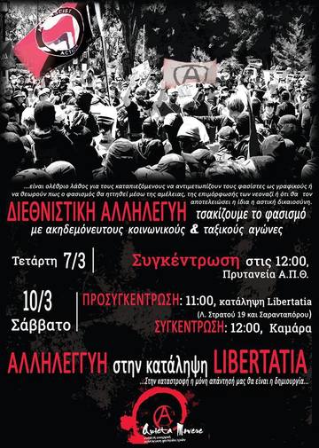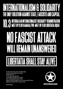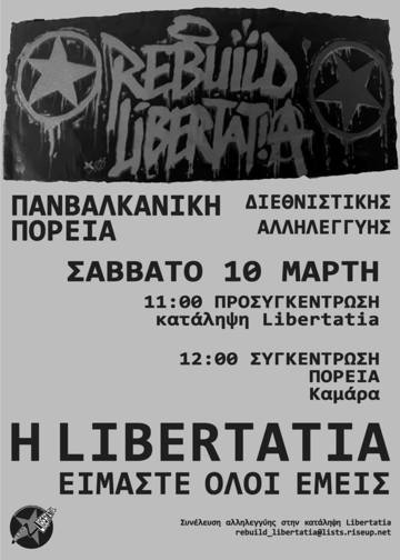 Για την πορεία στις 10/3Καλούμε τον κόσμο του κινήματος να στηρίξει την πανβαλκανική διεθνιστική πορεία αλληλεγγύης στην κατάληψη Libertatia, με τα προτάγματα της διεθνιστικής αλληλεγγύης και της υπεράσπισης των καταλήψεων και των δομών του αγώνα. Σε συνέχιση της αντανακλαστικής πορείας για τον εμπρησμό της κατάληψης μας στις 22/3 και των δράσεων αλληλεγγύης σε όλο τον ελλαδικό χώρο και σε άλλες χώρες, καλούμε συντρόφους και συντρόφισσες από την Ελλάδα και τα Βαλκάνια στις 10/3 στην Θεσσαλονίκη για να δοθεί μια μαζική απάντηση στον εθνικιστικό παροξυσμό και τις φασιστικές επιθέσεις. Καμία φασιστική επίθεση να μην μείνει αναπάντητη. Η Libertatia θα μείνει!