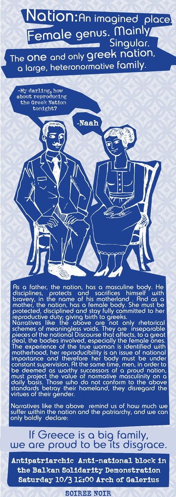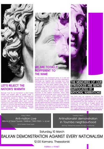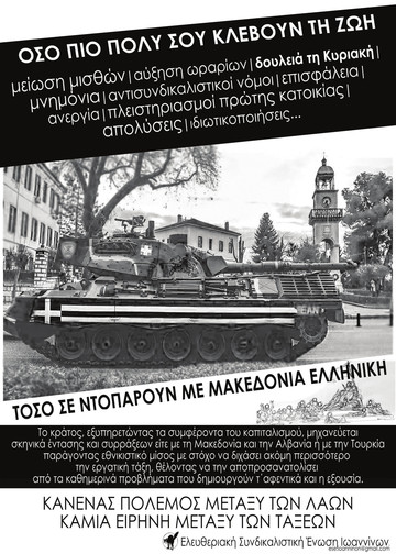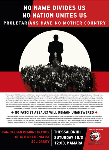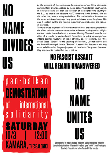 At the moment of the continuous de-evaluation of our living standards, current affairs are monopolised by the so called "macedonian issue", which in reality is nothing less than the accession of the neighbouring country to the E.U., so that it can advocate NATO's interests in the Balkans. We, on the other side, have nothing to divide us. The authoritarians' interests are the same, whatever language they speak, whatever name they have. We owe it to claim our life and freedom in common, against names and national identities.