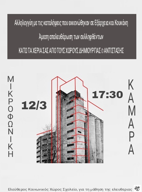 Το κράτος οξύνει την επίθεσή του απέναντι στον κόσμο του αγώνα, αποβλέποντας στην αποσυσπείρωση και αποδυνάμωση του αναρχικού/αντιεξουσιαστικού χώρου. Οι αναρχικοί όμως δεν πρόκειται να πάνε στα σπίτια τους, όσα χτυπήματα και αν δεχτούν. Γιατί απέναντι στις επιθέσεις της κυριαρχίας, η απάντησή μας είναι η αλληλεγγύη μεταξύ των καταπιεσμένων και όσων αγωνίζονται ενάντια σε κράτος και κεφάλαιο. Οι καταλήψεις είναι οργανικό κομμάτι του αγώνα. Χώροι απελευθερωμένοι από τον πανοπτικό έλεγχο του κράτους και του κεφαλαίου. Είναι χώροι όπου χτίζονται σχέσεις συντροφικότητας και αλληλεγγύης, φιλοξενώντας αυτοοργανωμένες διαδικασίες και συνελεύσεις, προεικονίζοντας την κοινωνική αυτοδιεύθυνση για την οποία αγωνιζόμαστε. Ο αγώνας όμως ούτε αρχίζει, ούτε τελειώνει στις καταλήψεις. Από τους χώρους εργασίας και τις σχολές, μέχρι τις γειτονιές και τους δρόμους, οφείλουμε να οξύνουμε την κοινωνική και ταξική σύγκρουση, με τις δυνάμεις που διαθέτουμε, έχοντας ως όπλα μας την αυτοοργάνωση, την αλληλεγγύη και το πάθος για μια κοινωνία χειραφετημένη από τα δεσμά του κράτους και του κεφαλαίου, αποδεσμευμένη από το βραχνά κάθε εξουσίας.