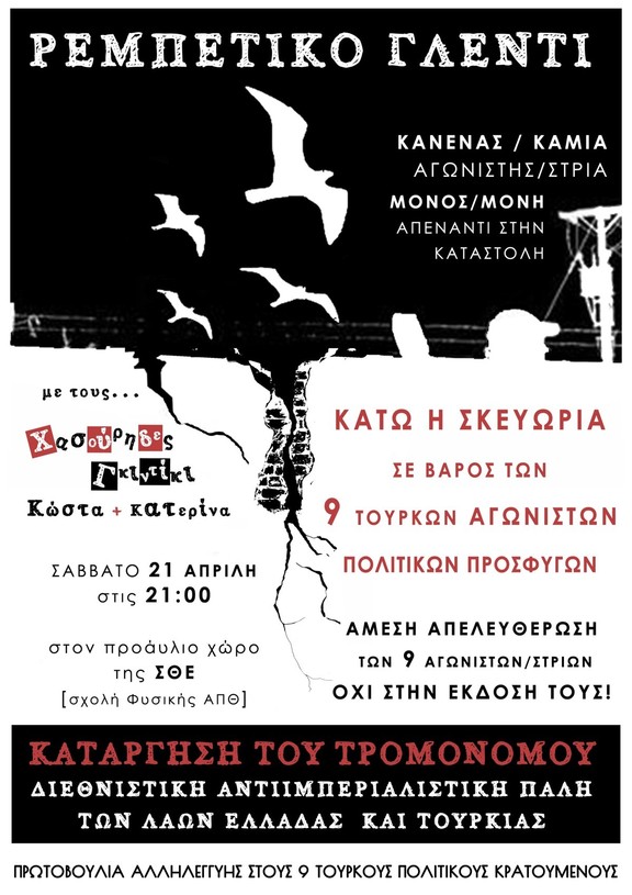 Το Σάββατο 21/4 μετά τις 21:00 έξω από την ΣΘΕ/Φυσικό ΑΠΘ θα πραγματοποιηθεί ρεμπέτικο γλέντι για την ενίσχυση της Πρωτοβουλίας αλληλεγγύης στους 9 τούρκους αγωνιστές πολιτικούς κρατούμενους.