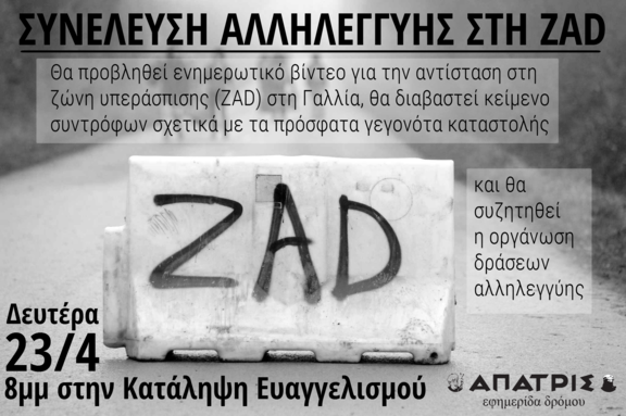 Θα προβληθεί ενημερωτικό βίντεο για την αντίσταση στη ζώνη υπεράσπισης (ZAD) στη Γαλλία, θα διαβαστεί κείμενο συντρόφων σχετικά με τα πρόσφατα γεγονότα καταστολής και θα συζητηθεί η οργάνωση δράσεων αλληλεγγύης.