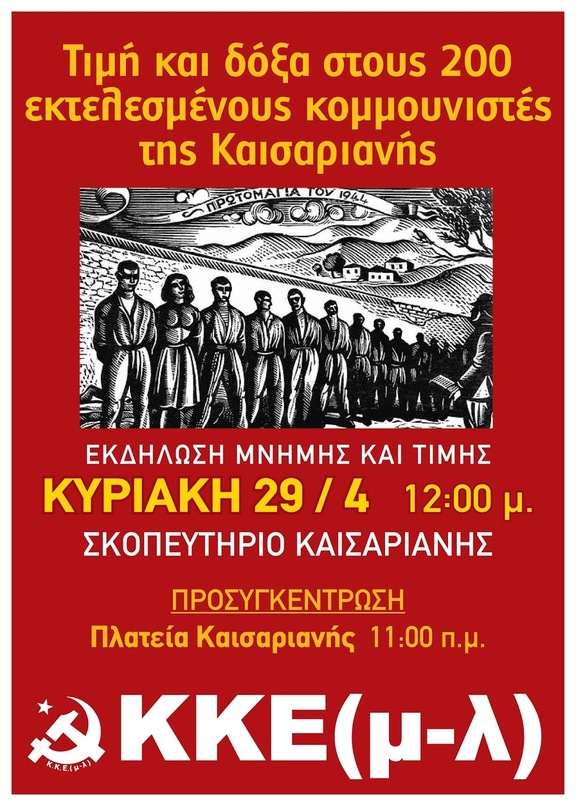 Μπροστά στην Εργατική Πρωτομαγιά και με αφορμή των επέτειο των 100 χρόνων από την ίδρυση του ΣΕΚΕ (ΚΚΕ), η οργάνωση Αθήνας του ΚΚΕ(μ-λ) διοργανώνει εκδήλωση μνήμης και τιμής στους 200 κομμουνιστές που εκτελέστηκαν στην Καισαριανή της 1η Μάη 1944 από τους ναζί κατακτητές.