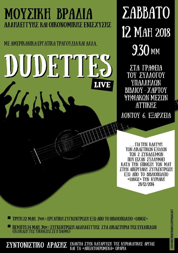Σαβ. 12/5, 9.30μμ, γραφεία ΣΥΒΧΨΑ :: DUDETTES - Μουσική βραδιά αλληλεγγυης και οικονομικής ενίσχυσης | Συντονιστικό δράσης ενάντια στην κατάργηση της Κυριακάτικης αργίας και τα «απελευθερωμένα» ωράρια