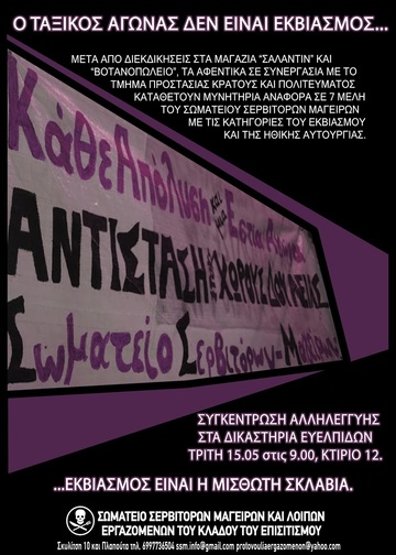 Φαίνεται πως η δράση μας και οι καθημερινοί μας αγώνες ενοχλούν τα αφεντικά του κλάδου, αλλά και τους μηχανισμούς του κράτους. Με την επιδιωκόμενη ποινικοποίηση του σωματείου αφενός ελπίζουν ότι θα μας κάμψουν οικονομικά και θα μας απονομιμοποιήσουν στα μάτια της κοινωνίας και αφετέρου νομίζουν ότι θα φοβηθούμε και θα το ξανασκεφτούμε να διεκδικήσουμε ό,τι μας ανήκει, δρώντας στο κινηματικό πλαίσιο που μέχρι στιγμής κινούμαστε. Μπορεί να ελπίζουν ότι θα ξεχάσουμε τη μαύρη εργασία, τα απλήρωτά μας μεροκάματα, τις εξευτελιστικές συνθήκες που επικρατούν όχι μόνο στο κλάδο μας, αλλά και συνολικά σε όλους τους χώρους δουλειάς. Απέναντι σε όλα αυτά εμείς δηλώνουμε ευθαρσώς ακόμα πιο πεισμένοι και αποφασισμένοι, συλλογικά και οργανωμένα, ότι θα εντείνουμε τον αγώνα και την παρέμβαση μας στον κλάδο του επισιτισμού.