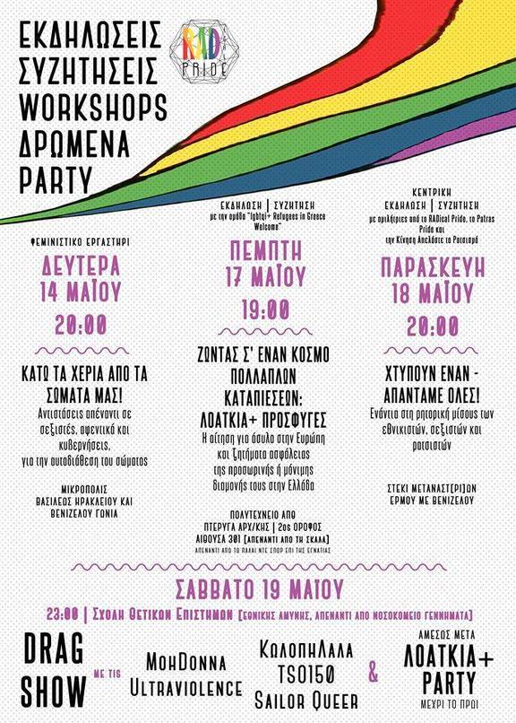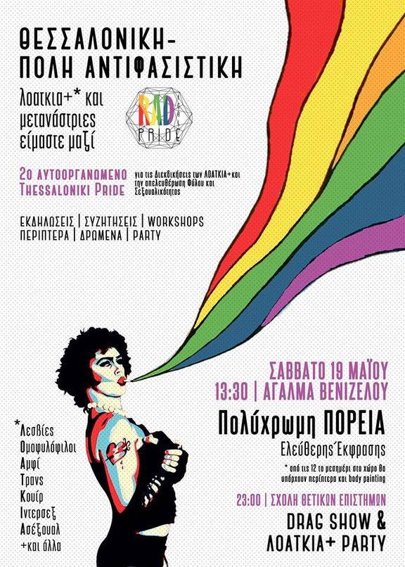 Οι εκδηλώσεις του 2ου Αυτο-οργανωμένου Thessaloniki Pride θα λήξουν το βράδυ μετά την Πολύχρωμη Πορεία μας, με Drag Performance από τις MohDonna, Ultraviolence, ΚωλοπηΛάλα, TSO150 και Sailor Queer και στη συνέχεια ΛΟΑΤΚΙΑ+ Πάρτι μέχρι το πρωί! Σας Περιμένουμε!!