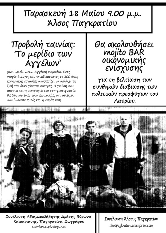 Την Παρασκευή 18/5, στις 9μμ., στο Άλσος Παγκρατίου (στρογγυλή πλατεία) θα προβληθεί η ταινία: "Το μερίδιο των αγγέλων" του Ken Loach, παραγωγής 2012. Θα ακολουθήσει mohito bar με post-punk μουσική. Η εκδήλωση θα έχει τον χαρακτήρα οικονομικής ενίσχυσης ώστε να αγοραστούν υλικά για τη βελτίωση των δύσκολων συνθηκών διαβίωσης των πολιτικών προσφύγων του Λαυρίου (κοντέινερς).