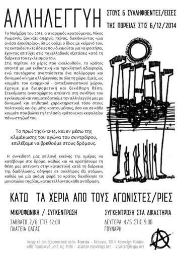ΑΛΛΗΛΕΓΓΥΗ ΣΤΟΥΣ 6 ΣΥΛΛΗΦΘΕΝΤΕΣ-ΕΙΣΕΣ ΤΗΣ ΠΟΡΕΙΑΣ ΤΗΣ 6ΗΣ ΔΕΚΕΜΒΡΗ 2014 ΣΤΗΝ ΠΑΤΡΑ