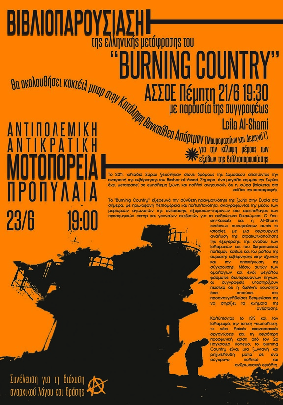 Την Πέμπτη 21 Ιούνη στις 19:30 στην ΑΣΟΕΕ, θα πραγματοποιηθεί παρουσίαση της ελληνικής μετάφρασης του βιβλίου "Burning Country".