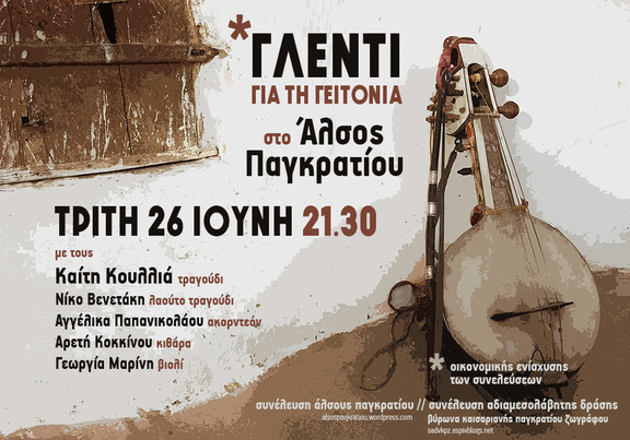 Την Τρίτη 26/6, στις 9.30μμ., στο Άλσος Παγκρατίου, θα πραγματοποιήσουμε το καθιερωμένο ετήσιο παραδοσιακό γλέντι με την Καίτη Κουλλιά και το συγκρότημά της. Τα έσοδα θα διατεθούν για την οικονομική ενίσχυση των δύο συνελεύσεων.