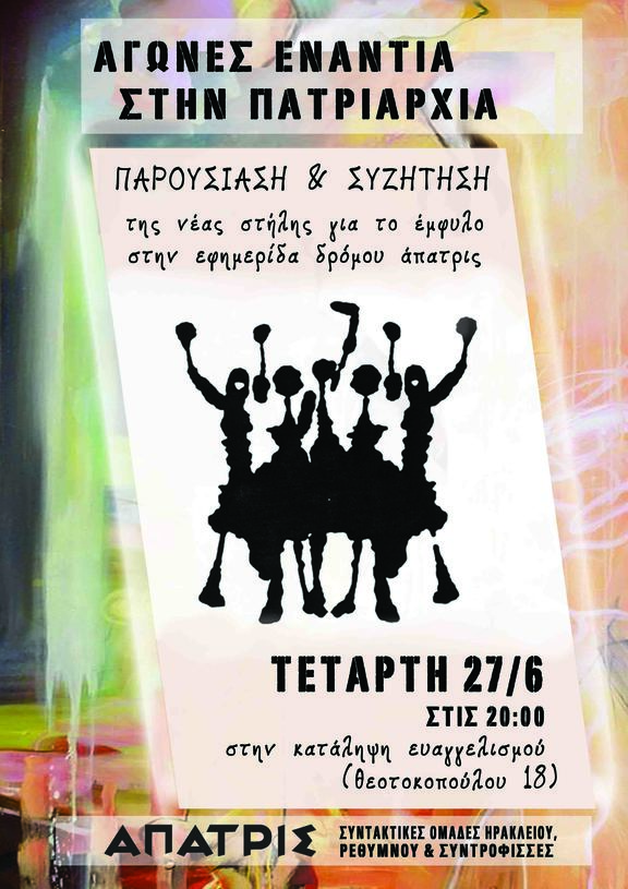 Παρουσίαση της νέας στήλης για το έμφυλο ζήτημα στην εφημερίδα δρόμου άπατρις. Θα μιλήσουν άτομα από τις συντακτικές ομάδες Ηρακλείου, Ρεθύμνου και συντρόφισσες.